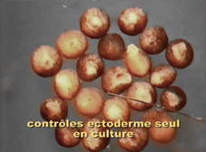 7-Les résultats morphologiques de la recombinaison ecto-endodermique après 24h de culture sont comparés à ceux obtenus en culture isolée de chaque explant séparé (contrôles ectodermiques et endodermiques). On observe que les recombinaisons s'allongent notamment au niveau des tissus issus de l'ectoderme. Cet allongement traduit l'apparition et la mise en oeuvre des mouvements de convergence extension qui ont lieu normalement pendant la gastrulation et qui sont le propre des tisssus mésodermiques dorsaux. Ce critère morphologique est donc le premier signe qu'une partie des tissus ectodermiques a été induit en mésoderme.