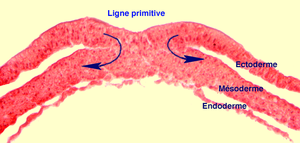 Le mésoderme intermédiaire entre l'ectoderme superficiel et l'endoderme profond se met en place par des mouvements d'immigration cellulaire (flèches) qui passent par la ligne primitive.