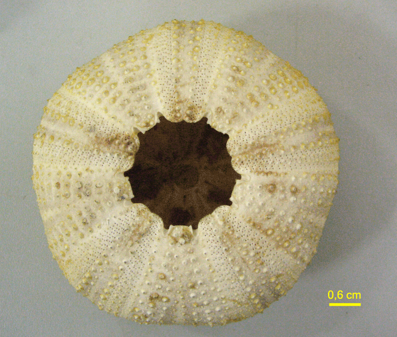 Les dix encoches qui entaillent la face inférieure du test à la limite de la membrane péri-buccale sont caractéristiques des Toxopneustidae.