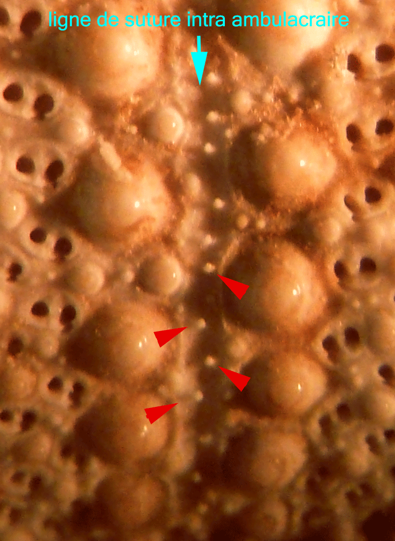 Psammechinus miliaris Sphérides disposés en quinconce, de part et d'autre de la ligne de suture des plaques ambulacraires