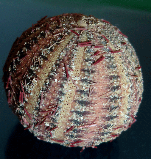 Oursin de petite taille, 25 mm en moyenne , caractéristique par sa forme globoïde. Radioles courts, couleur lie de vin. Origine: côtes sud australiennes.