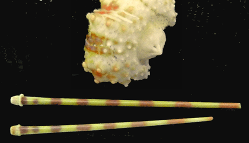 centrales des aires ambulacraires de couleur poupre, bordures rouges.