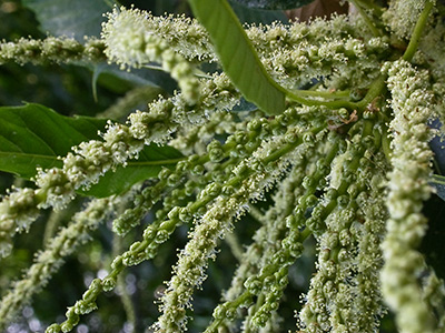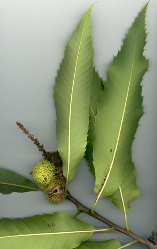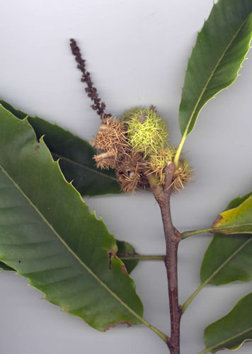 Feuillage de Châtaignier. On distingue les bogues contenant les châtaignes. |