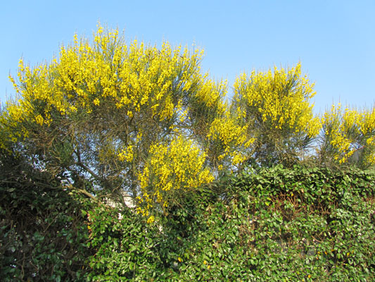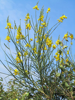 Le Genêt d'Espagne ou Spartion (Spartium junceum L. de la famille des Fabacées) est un arbuste de moyenne taille qui fleurit pendant de longues périodes. Le terme "Genêt" recouvre en fait de nombreuses espèces de différents genres ( Cytisus, Genista, Sarothamnus...) Il ne faut pas le confondre avec Genista hispanica, nom latin ou scientifique qui désigne une toute autre espèce.