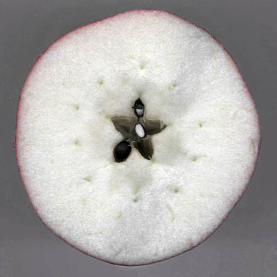 La conséquence du développement de l'ovaire infère est que la pomme (comme la poire) est un faux fruit dans lequel toute la partie externe est constituée par le développement du réceptacle floral.