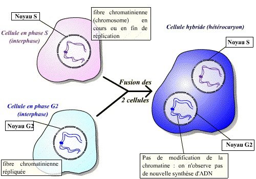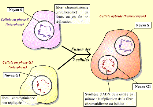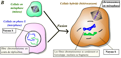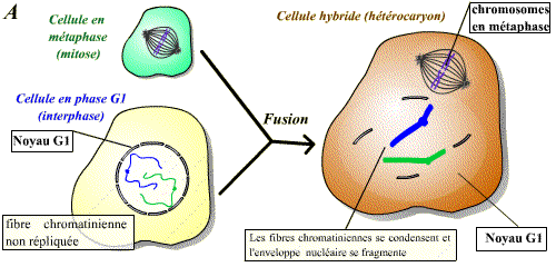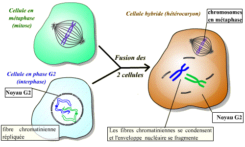 La fusion d’une cellule en mitose et d’une cellule en interphase permet d'observer une condensation des chromosomes issus de la cellule en interphase. Un facteur présent dans la cellule en mitose induit donc visiblement une "entrée en mitose" précoce du noyau de la cellule en interphase. Ce facteur est le MPF.