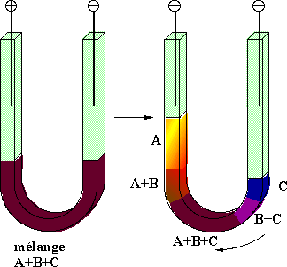 des molécules, suivant qu'elles migrent vers la cathode ou vers