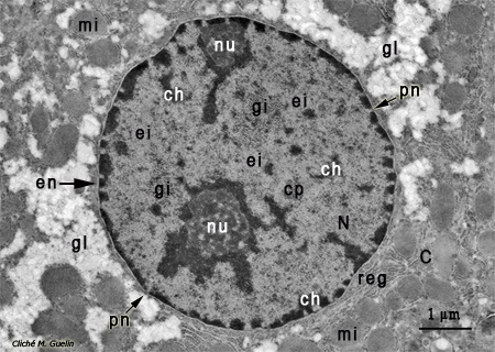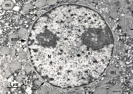 Il est donc utile, si l'on veut explorer l'ultrastructure des noyaux cellulaires, de disposer d'échantillons des deux types. 2 - Si l'on se repère aisément, malgré tout, dans le cytoplasme - en tout cas après une double fixation - l'aspect du noyau en revanche, moins familier, apparaît peu lisible. |