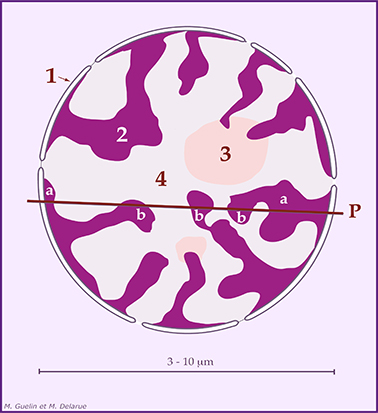 l'interphase. 3 - un NUCLÉOLE, site de la fabrication des ribosomes - ou plusieurs (ici : deux), selon le nombre d'organisateurs nucléolaires de l'espèce, éventuellement corrigé par des fusions, survenant au début de l'interphase, entre plusieurs unités nucléolaires. L'espace laissé libre entre chromatine et nucléoles est le nucléoplasme, réduit à des travées appelées "espaces interchromatiniens" (4).