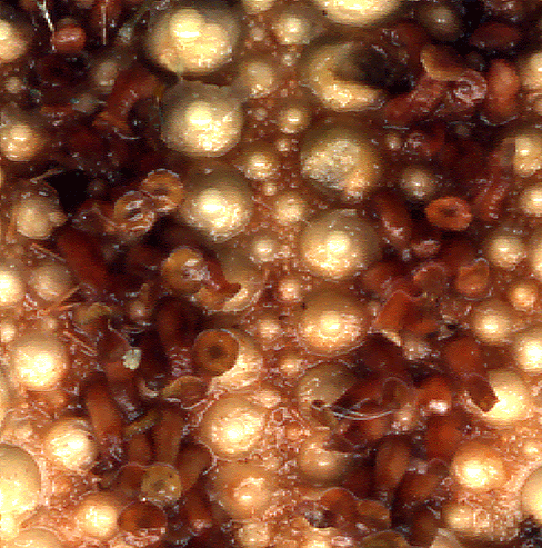 Détail de la région ambulacraire montrant les podia colomniformes surmontés d'une ventouse. Cliquez sur l'image pour voir les légendes.